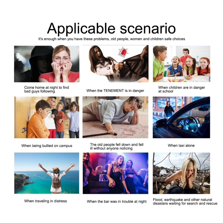 8. How to use: pull out the metal pin of the personal alarm, and the alarm will sound immediately; push back the pin, and the alarm will be turned off immediately; press and hold the switch to turn on the LED light, and release it to turn off.
